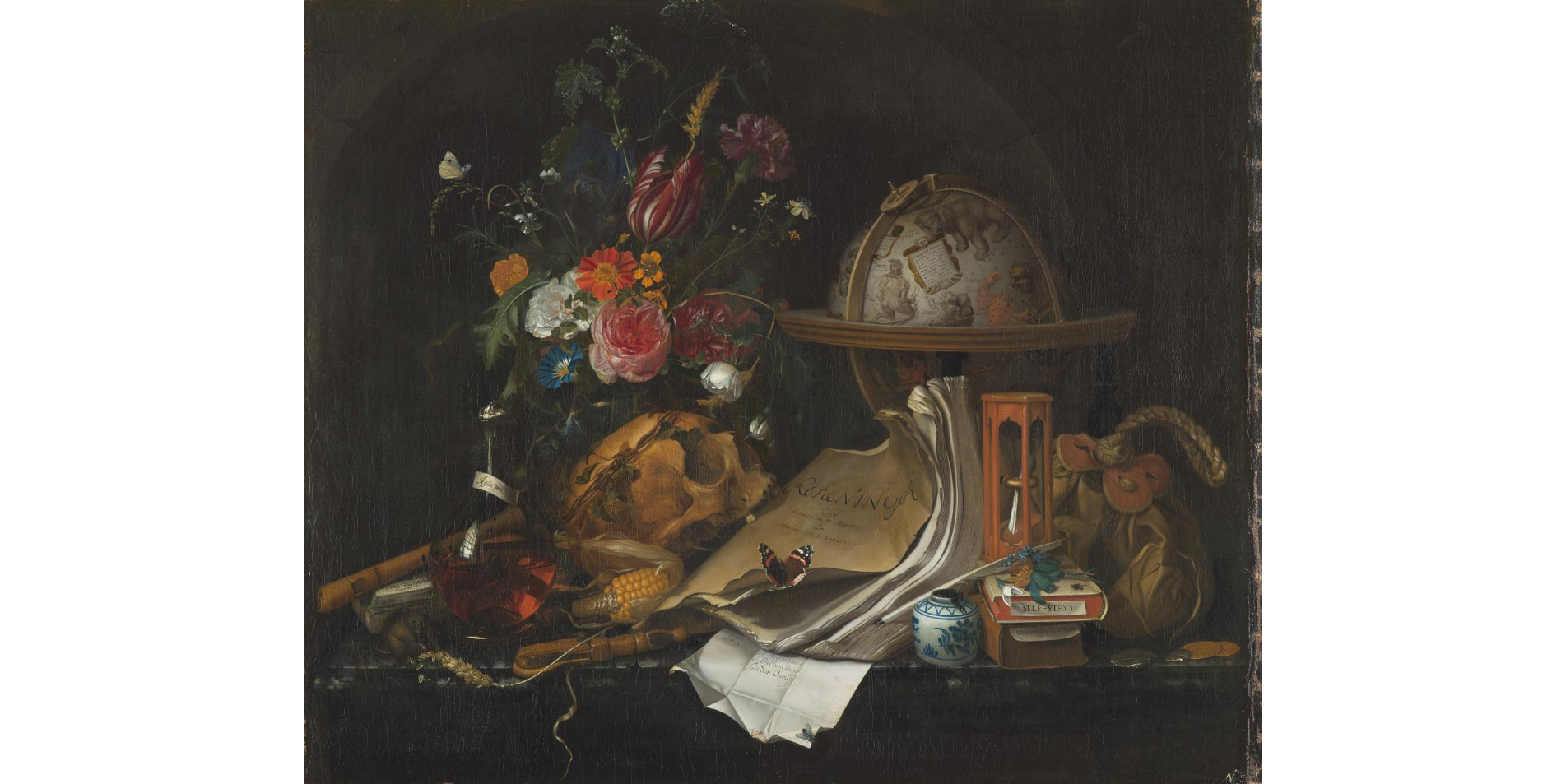 Работая над натюрмортами, умело режиссирует поставленный ею аллегорический спектакль. В состав натюрмортной группы здесь входит множество предметов, говорящих о желании человека увековечить себя и деяния: глобус, книги, письменные принадлежности, флейта, ноты, кошелёк с деньгами и монеты. В то же время намекают на тщетность этих усилий — череп, цветок. Присутствует фляжка, как спасение души, где на этикетке читается надпись: «Вода жизни». Надпись указывает на текст из Библии, на одно из мест Апокалипсиса: «И показал не чистую реку воды жизни, светлую, как кристалл, исходящую от престола Бога и Агнца» (Откровение Иоанна Богослова, 22:1)[6].