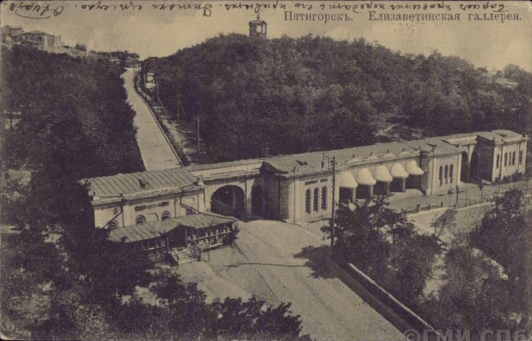 Первый минеральный источник в Пятигорске был обнаружен в 1810 году, его и назвали Елизаветинским. Сначала целебную воду черпали кружками из вырытого колодца, а в 1814 году построили домик с ваннами. Через 9 лет колодец увеличили и облагородили территорию вокруг него, разбили клумбы. Для отдыхающих построили две деревянные галереи со скамейками[2].