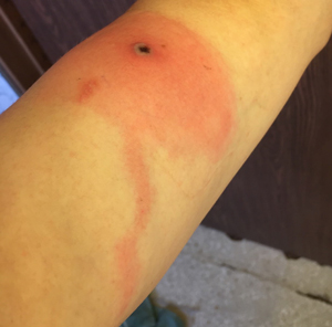 29 июля 2015 года женщина средних лет поступила в клинику неотложной помощи в Фэрбанксе с основной жалобой на подозрение на укус паука на правом плече. Она сообщила, что в течение пяти дней до обращения за медицинской помощью у нее наблюдались лихорадка, усталость, недомогание и болезненность лимфатических узлов. Также она отрицала какие-либо недавние контакты с другими больными людьми, поездки за пределы штата или рецидивирующие кожные инфекции. Осмотр врача подтвердил наличие поверхностной язвы диаметром около 1 см и двух соседних пузырьков меньшего размера диаметром около 2 мм на задней верхней поверхности правого плеча пациента. Изъязвление сопровождалось локальным уплотнением, повышением температуры и болезненностью, но не имело флюктуации или выделений.