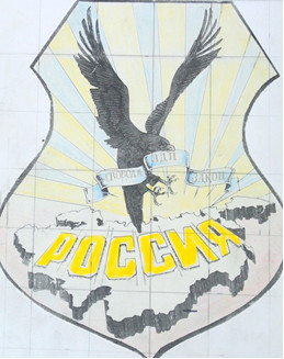 Поэтому молодому художнику-самоучке Александру Хромову я поручил, сохраняя понятную традиционность создать эскиз нужного характера. Через три недели постоянных консультаций эскиз герба был создан. В его цветовой гамме изначально был заложен сиренево-золотистый цвет. Я тогда вместе с психологами и сам лично занимался диагностикой по цветовому тесту Люшера, имел дома набор карточек и знал, что сиреневый и золотистый цвета при выборе - это путь поиска, успеха, мудрости, знания и прочая. Россия была изображена в лучший период своего расцвета середины 19 века с Финляндией, Польшей, Аляской и всей Средней Азией.