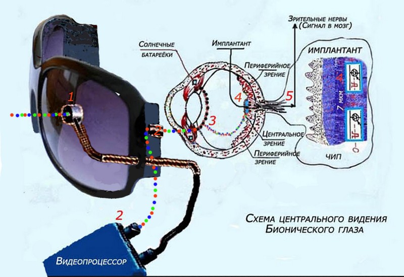 - Полученная информация через миниатюрный проводник передаётся на электроды фотосенсора (4), вживлённого в сетчатку;