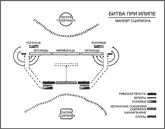 Растянув таким образом фланги, их командиры быстро двинулись на карфагенян — каждый во главе трёх пехотных когорт, трёх отрядов конницы и копейщиков. Остальное войско римлян последовало за ними по косой. В середине строя образовался прогиб — там медленно продвигались отряды испанцев. На флангах уже бились, а цвет неприятельской армии — карфагенские ветераны и африканцы не подошли ещё на перелёт дротика и не решались кинуться на помощь тем, кто сражался на флангах, чтобы не открыть римлянам, идущим прямо на них, путь через середину строя. Флангам карфагенян приходилось тяжело: всадники, легковооружённые и копейщики нападали с боков, когорты — лобовым ударом, чтобы отрезать фланги от остального войска[17].