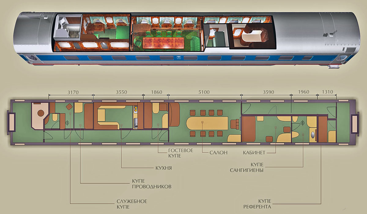 В новом вагоне зеленого цвета[2] СВ владелицы оснащен двуспальной кроватью из красного дерева и мягким матрасом, в нем есть зимний сад и биотуалет, ванная с джакузи, на окнах — шторы из плотной ткани. В кашпо по всему вагону стоят живые растения (в основном — плющ).