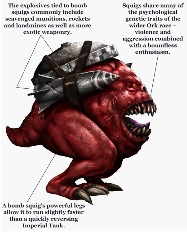 Сквигобомбы видели на полях сражений со всеми видами взрывчатки: от Танкбаста-Бомб и мин-ловушек до взрывающихся черепных трансплантов, но чаще всего просто с кучей привязанных Стиккбомб. В отчётах Империума содержится информация о том, что катастрофический Прорыв Ультрезика начался с одного безумного Сквига-Бомбы, влетевшего в середину Корсканского 3го Артиллерийского с зажатой в зубах вортексной гранатой. Чаще всего таких сквигов используют Танкбасты.