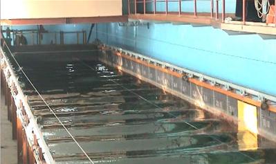 Как правило, волнопродукторы размещаются в торцевой части опытового бассейна и представляют из себя водоизмещающее тело, совершающее вынужденные колебательные движения[3]. Например, возможным вариантом такого волнопродуктора является расположенный под поверхностью воды цилиндр, эксцентрично сидящий на оси вращения. При запуске под водой вращения такого цилиндра на её поверхности возникнет регулярное волнение с предсказуемой амплитудой и свойствами[4]. Кроме этого, получили широкое распространение пневматические волнопродукторы, принцип действия которых основан на периодическом изменении давления воздуха внутри колокола, полупогруженного в воду. Если требуется создавать волны, распространяющиеся под разными углами и с широким диапазоном параметров, то для этого сооружаются волнопродукторы на взаимно перпендикулярных сторонах бассейна[5].