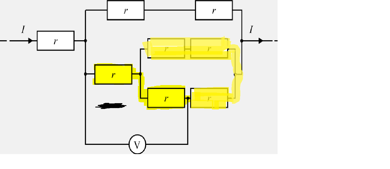 Вольтметр измеряет напряжение на том участке цепи между которым он заключён. Например в этом случае напряжение измеряется на выделенных резисторах.