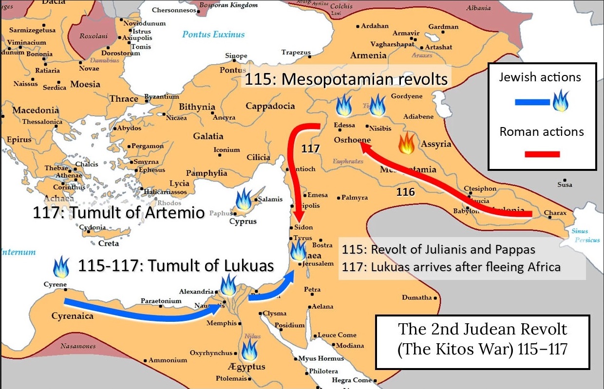 Уже в 115 году восстали евреи Киренаики (современная Ливия) во главе с Андреасом, и/или Лукуасом (Лукой), объявленного евреями царём. Вскоре восстание евреев распространилось на Египет, Кипр и Месопотамию. В Месопотамии евреям и парфяном удалось отбить некоторые города, например, Селевкию.