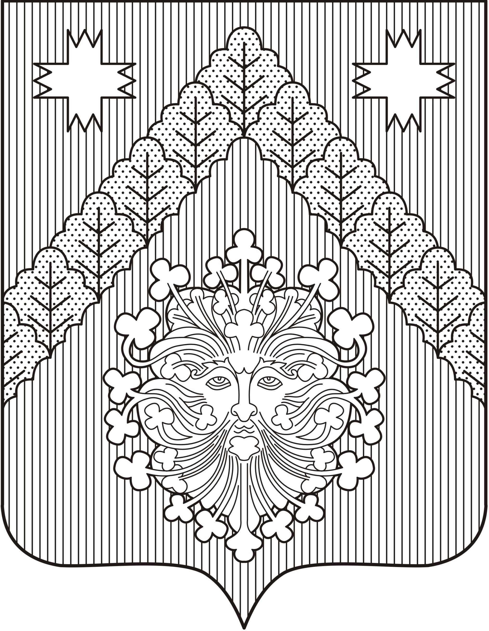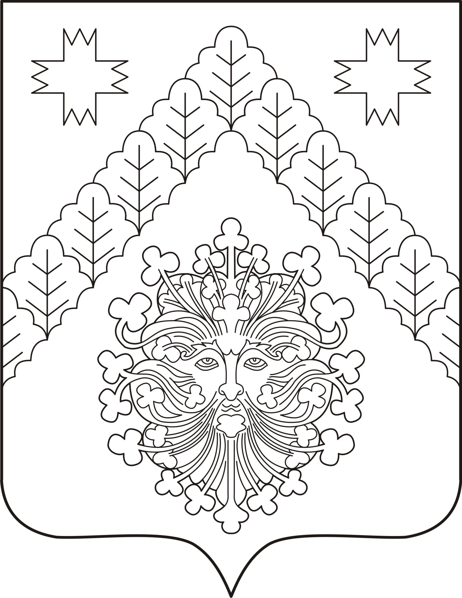 В червлёном поле отвлечённое вверху и смещённое вверх от нижних углов щита узкое стропило, выложенное золотыми дубовыми листьями, сопровождаемое вверху двумя дважды вырубленными серебряными вырубными крестами (по одному с каждой стороны), внизу – серебряным ликом мужа с буйными шевелюрой, бородой и усами, волосы которых завершаются трилистниками[4].