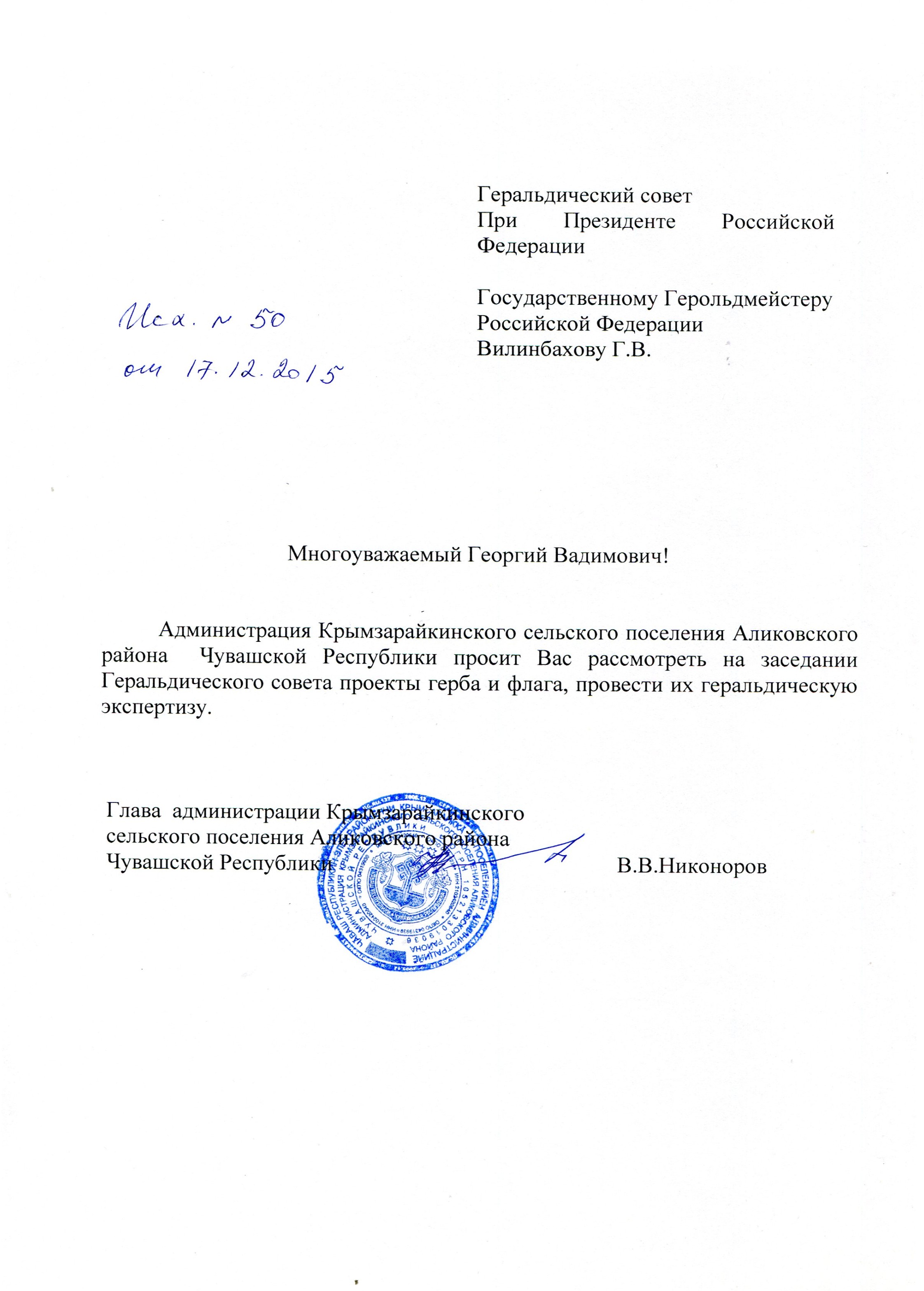 17 декабря 2015 года администрация Крымзарайкинского сельского поселения Аликовского района Чувашской Республики направила письмо в Геральдический совет при Президенте Российской Федерации с просьбой рассмотреть проектные материалы по гербу сельского поселения и провести геральдическую экспертизу.