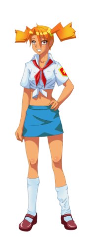 Имеет ярко-рыжие волосы средней длины, которые собраны жёлтыми заколками в два хвоста в форме логотипа Двача. Цвет глаз, как правило красный. Обычно носит короткую белую майку, мини-юбку, красный пионерский галстук, обувь — от сандалий до берцев и сапог.