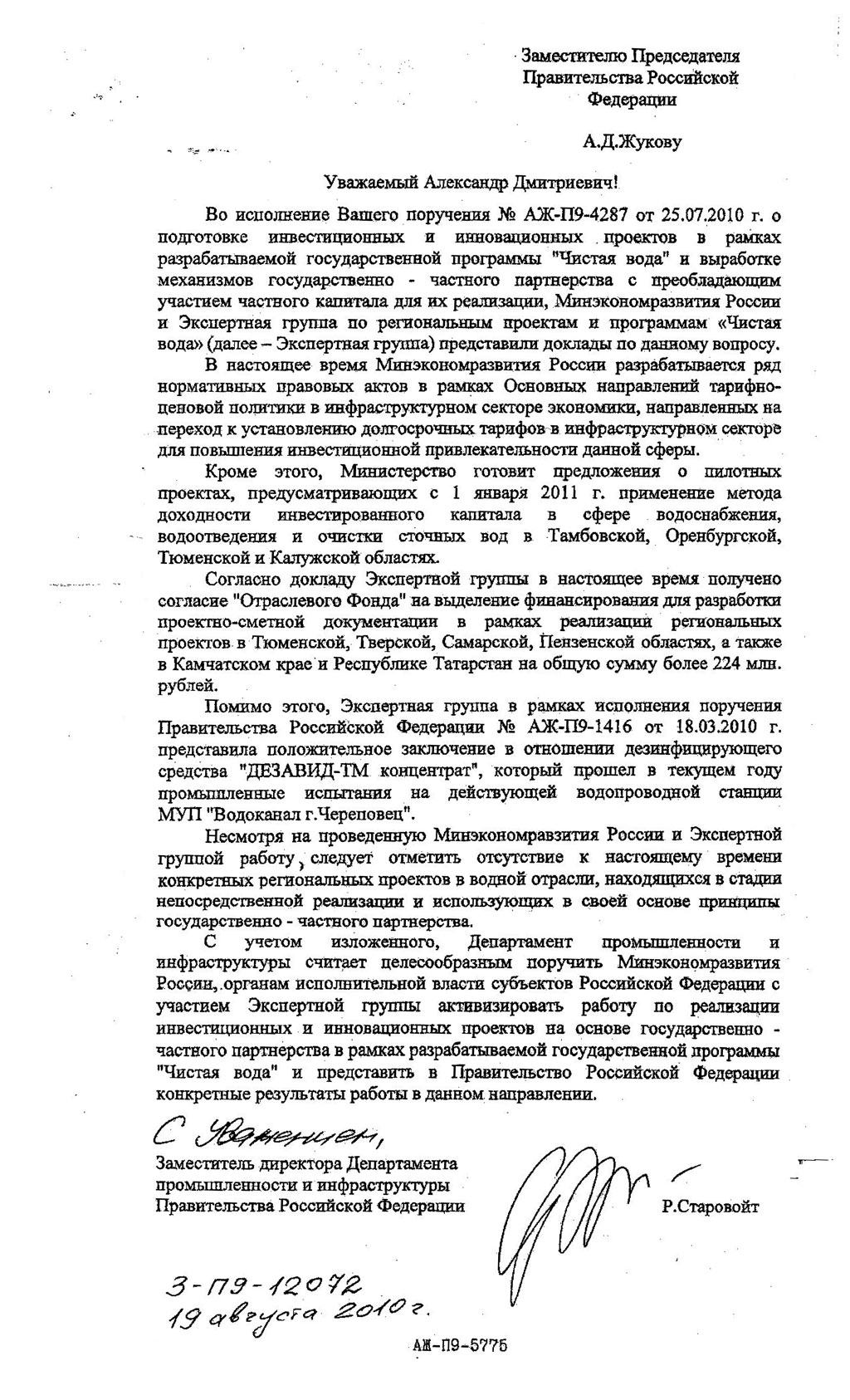 Одновременно в тот же период проводились испытания и в ГУП «Водоканал Санкт-Петербурга», итогом которых в декабре 2009 года во исполнение задания по служебной записке № 02-16-1039/09 от 11.12.2009 года стало письмо заместителя директора по производству Е. Д. Нефедова на имя первого заместителя генерального директора Е. И. Целикова о неэффективности препарата «ДЕЗАВИД» для обеззараживания природных и сточных вод в связи с низким бактерицидным эффектом на рекомендованных дозах и превышением нормативных значений остаточными концентрациями составляющих препарата при использовании повышенных доз.