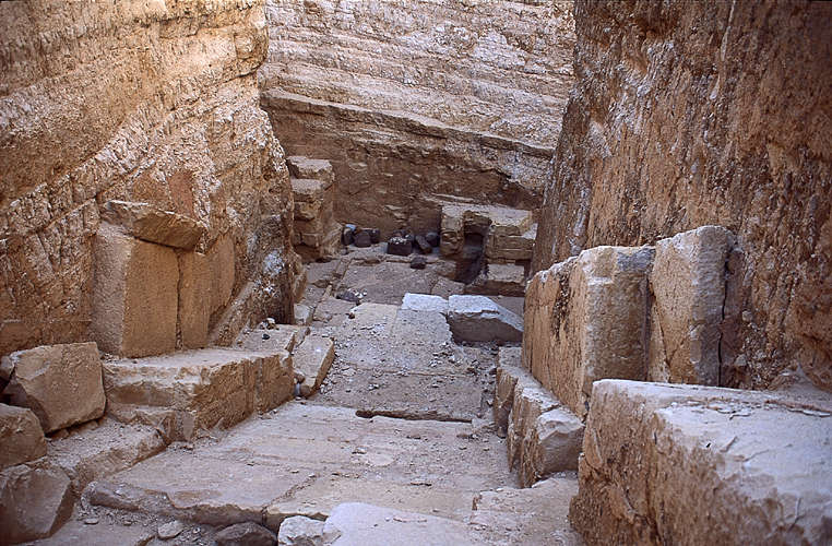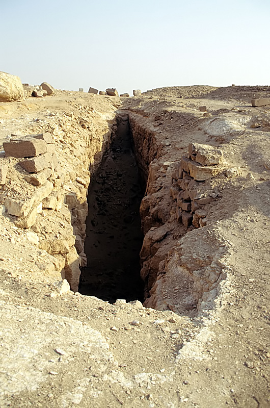 От кирпичного заупокойного храма у восточной стороны пирамиды почти ничего не осталось. Развалины нижнего храма находятся где-то под песком, если идти по «восходящей» дороге, трасса которой частично прослеживается на протяжении 750 метров. Восточнее заупокойного храма в скальной породе вырублена траншея десятиметровой глубины, длиной 35 метров и шириной 3,7 метра. Она, несомненно, предназначалась для царской «солнечной ладьи». Дно её покрыто красноватой известняковой крошкой и обломками. В них легко узнаются фрагменты статуй, разбитых, без сомнения, умышленно и одновременно. Разбитые изваяния Джедефры, возможно, свидетельствуют о междоусобной борьбе двух братьев, закончившейся победой Хафры[6].