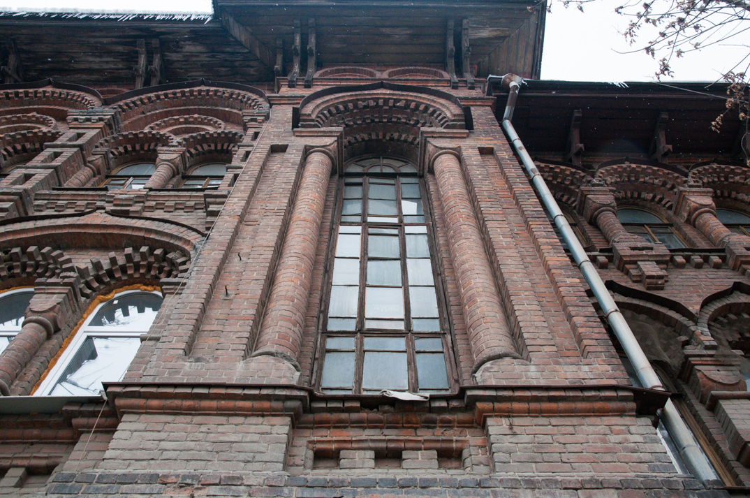 Второй и третий этажи украшены декором: окна заключены в ажурные наличники в форме кокошников, которые опираются на кувшинообразные колонны на втором этаже и колонны с балясинами на третьем.