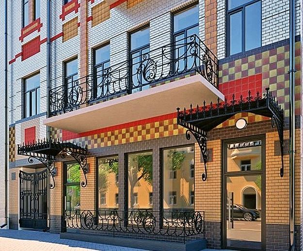 Здание трёхэтажное из красного керамического кирпича, прямоугольной формы, с мансардой, тремя балконами с коваными ограждениями и с аркой проезда во двор. Сплошное покрытие уличного фасада керамической плиткой (майолика и терракотовая) шести цветов, от палевой до тёмно-коричневой, делает здание уникальным[10].