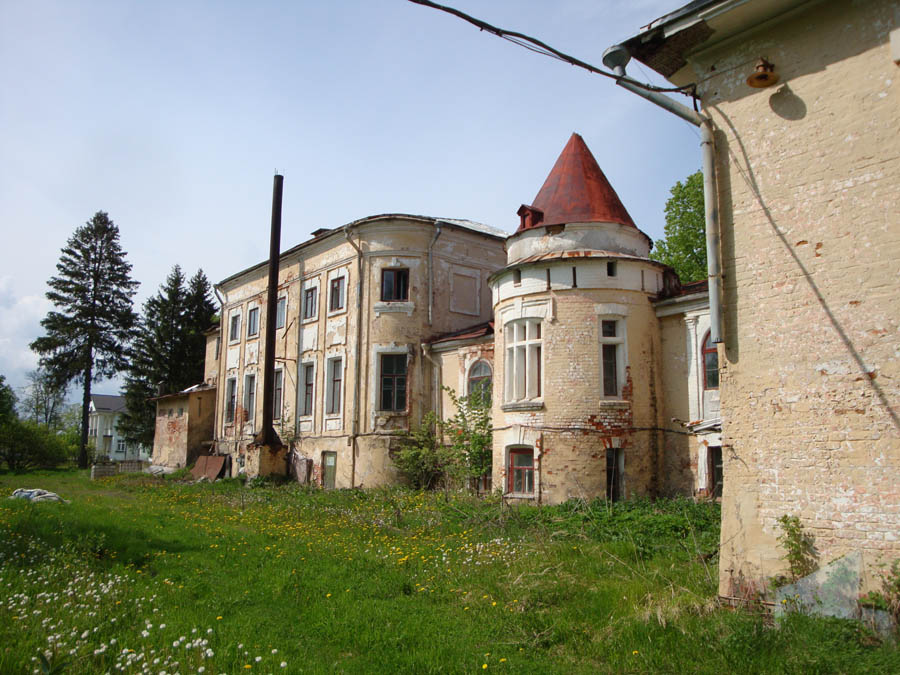 Главный трехэтажный усадебный дом был построен в 1770-х г.г. в стиле классицизма. Это каменный дом с закругленными углами по главному фасаду, с деревянными фронтонами. На крыше был устроен миниатюрный бельведер в два арочных окна. Фасады украшались плоской декорацией: пилястрами, накладными досками и филёнками, а также были снабжены балконами. Вход сопровождался каменной террасой, огражденной балюстрадой и двумя лестничными маршами, спускающимися в парк.