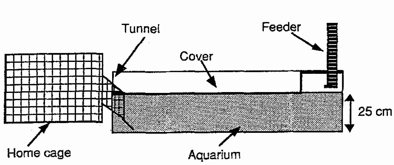В лабораторных условиях крысы мужского пола в возрасте 60 дней помещались в клетку по 6 особей с выходом на бассейн. В другом конце бассейна находилась кормушка, пищу из которой необходимо было принести в клетку, чтобы съесть.[1] Дистанцию около 1 метра крысе нужно было проплыть под водой. В ознакомительный период (2 дня) в бассейне не было воды, в последующие 7 дней она постепенно прибывала. Сравнивались крысы пород Long-Evans (LE) и Wistar (WI).[1]