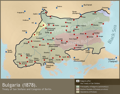 Согласно Сан-Стефанскому мирному договору от 3 марта 1878 года, завершившему русско-турецкую войну 1877-1878 гг., Болгария объявлялась автономным княжеством, которое должно было находиться под русским управлением 2 года, а затем чисто номинально платить дань Турции. Помимо современных территорий Болгария включала в свой состав обширные территории в Македонии (с городами Охрид, Скопье, Серры), Фракии и, таким образом, новое государство простиралось от Черного моря до Эгейского, от Дуная до Охридского озера. Однако, под нажимом Англии и ряда других европейских государств, мирный договор был пересмотрен Берлинским трактатом от 13 июля 1878 года, согласно которому Болгария делилась на 3 зоны: вассальное Болгарское княжество-данник от Дуная до гор Стара-Планина (центр София), Восточную Румелию (центр Пловдив) — болгарские территории к югу от гор образовавшие автономную провинцию Османской империи, и третья часть — Фракия и Македония, которые всецело вернулись в состав Турции. Таким образом, территория собственно болгарского государства была урезана более, чем в 2 раза.