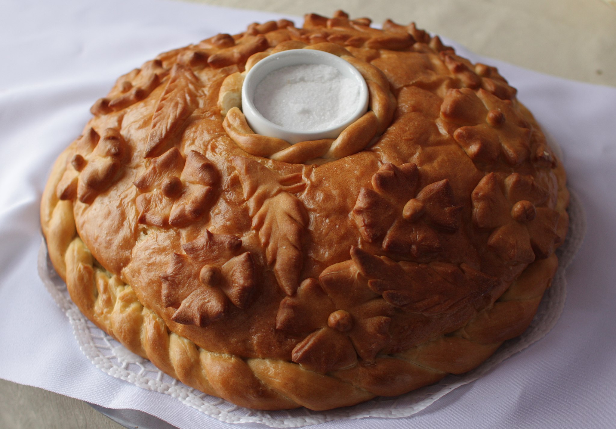 По русскому обычаю, дорогих гостей встречают «хлебом — солью» — ржаным караваем, который выносят на вышитом полотенце — рушнике. Дегустирование кусочка хлеба с солью символизировало вступление в дружеские отношения с хозяевами, готовность равномерно разделять все трудности и заботы. Это было проявлением благодарности и уважения к гостеприимным хозяевам[5].