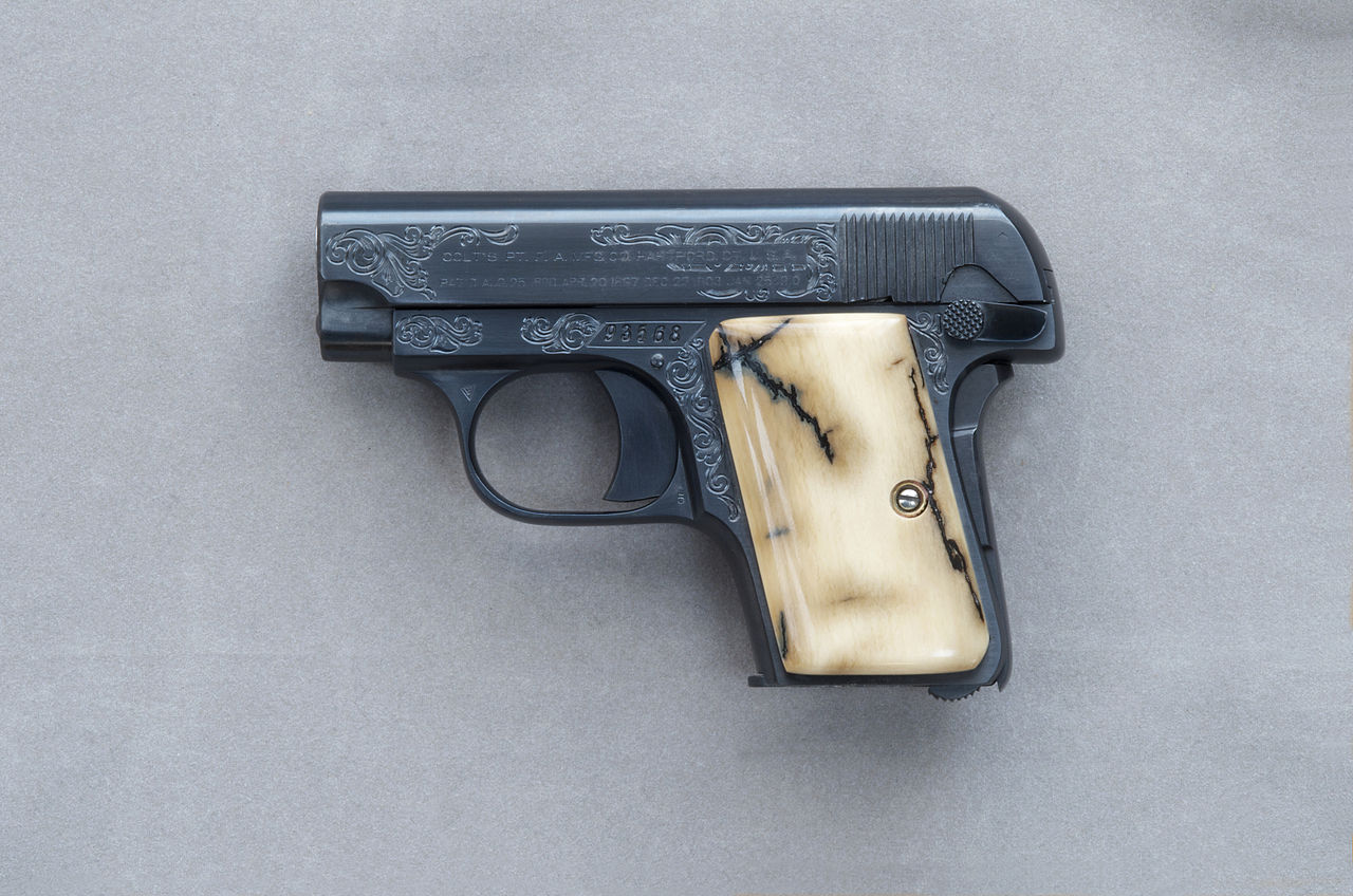 Colt 1908 В каталоге 1929 года: «Маленький пистолет (безкуровый, самозарядный 25-го калибра) особенно популярен среди женщин. Его размер, форма и вес обеспечивают максимальную защиту среди оружия, которое соответствует дамской руке, и легко и удобно носится». |
