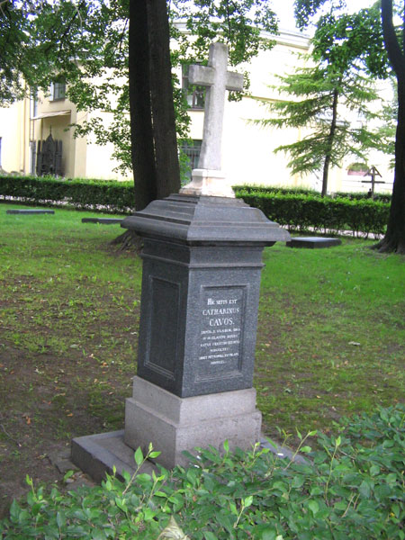 Катарино Кавос был похоронен на Волковском кладбище в Петербурге; в 1936 году в связи с многочисленными преобразованиями в стране, в том числе и с созданием на территории монастыря Свято-Троицкой Александро-Невской Лавры музея «Ленинградский некрополь»[14], прах К.Кавоса вместе с памятником был перенесен туда — в Некрополь мастеров искусств в Александро-Невскую лавру. Памятник представляет собой четырехконечный крест белого мрамора на прямоугольном гранитном постаменте с профилированным завершением, ступенчатом основании и цоколе. На лицевой стороне постамента вырублена надпись на латинском языке: HIC SITUS EST/CATHARINUS/CAVOS/IMPER. S. VLADIM ORD/lV CLASSIS EQUES/ NATUS VENETIIS XXX OCTO / MDCCL XXV/ ОВИТ PET-ROPOLI XXVIII. ARP./ MDCCCXL. (Перевод: Здесь покоится Катарино Кавос, императорского ордена св. Владимира 4-й степени кавалер. Родился в Венеции 30 октября 1775, скончался в Петрополе 28 апреля 1840)[15].