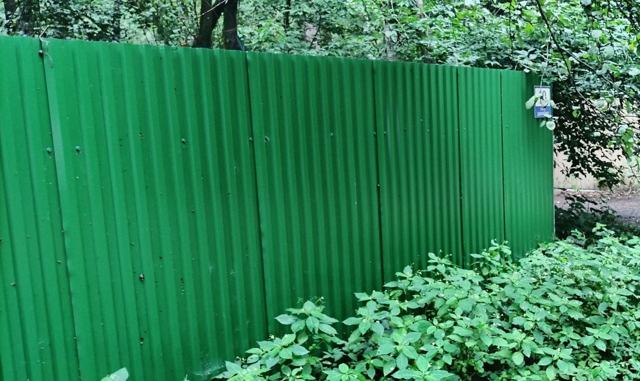 - Профнастил. Профилированный металлический лист, несмотря на небольшую толщину, обладает достаточной прочностью. К числу его достоинств можно отнести лёгкость монтажа и высокую вариативность цветов: он хорошо поддаётся окрашиванию. Недостаток: плохо сопротивляется ветру, поэтому ограждение из профнастила необходимо устанавливать на ленточный фундамент или винтовые сваи.