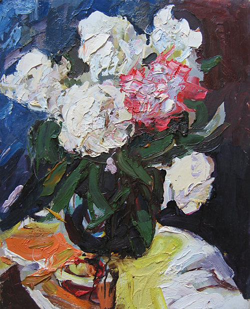 В 1960-1980-е годы А. Коровяков часто обращается к жанру натюрморта. Здесь, как и в работе над пейзажем, для него каждый раз недостаточно решения чисто формальных задач живописи. Его композиции неизменно оригинальны по замыслу, сложны по фактуре и технике письма, исполнены ассоциативного подтекста, как, например, «Осенний натюрморт»[17] (1972), «Шиповник» (1969), «Натюрморт с капустой» (1972), «Букет» (1979).