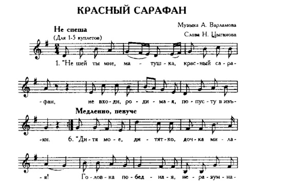 - ↑ А. Варламов, Н. Цыганов - Красный сарафан (с нотами). Авторские песни. Проверено 8 апреля 2025.