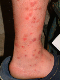 Также может кусать человека собачья блоха Ctenocephalides Canis[5]. Люди страдают аллергическими реакциями на слюну блох в виде высыпания. Зуд и воспаление может сохранятся в течение нескольких недель после укусов[6].