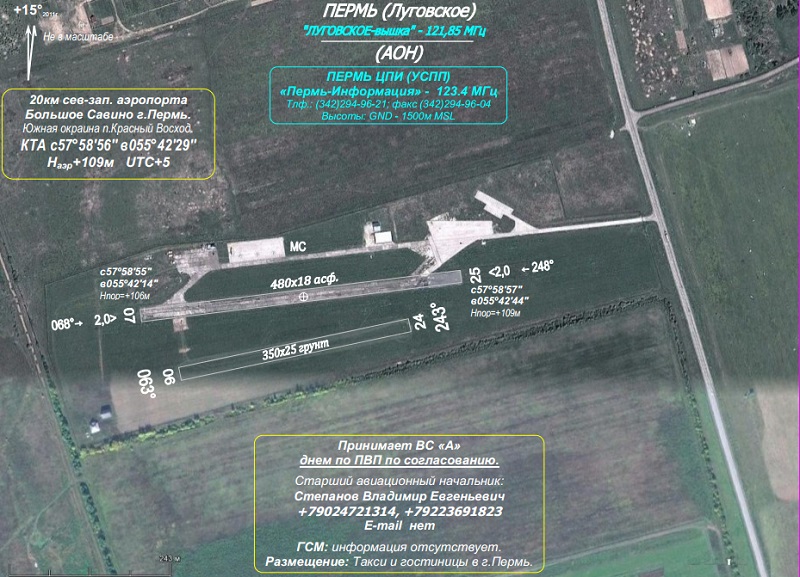- ↑ 1,0 1,1 1,2 1,3 1,4 1,5 1,6 Аэродром "Пермь (Луговское)" - Федерация авиации общего назначения России. flarf.ru. Проверено 11 декабря 2024.
