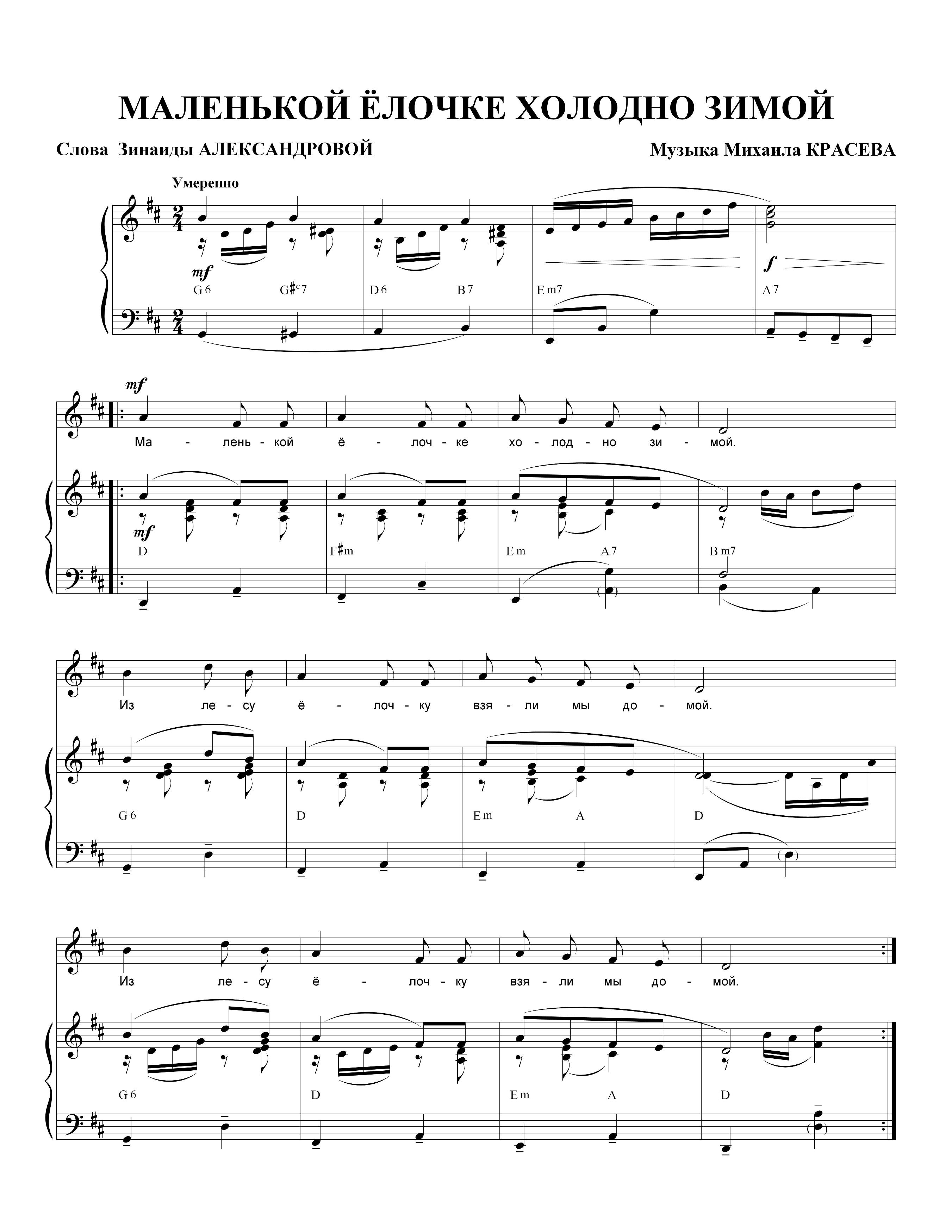 Михаил Красев, сочинивший незамысловатую, но притягательную мелодию к этим стихам, в 1920-е годы был руководителем одного из коллективов «Синей блузы», а когда это движение было запрещено, переключился на композиторскую деятельность, создав несколько музыкально-сценических произведений[6], в том числе для детей[7]. Песня про маленькую елочку вошла в один из его песенных циклов, а произошло это событие не иначе как во второй половине 1930-х годов: потому что с 1928 года советским гражданам было запрещено отмечать и Новый год, и Рождество, и ставить украшенную елку с игрушками; лишь 28 декабря 1935 года в газете «Правда» появилась статья секретаря ЦК компартии Украины Постышева с предложением возродить праздник новогодней елки, и уже на следующий день «Комсомолка» опубликовала постановление ЦК ВЛКСМ, подписанное его главой Александром Косаревым, в котором советским гражданам вменялось в обязанность «отметить новый праздник елки весело и без занудства»[8][9], иными словами, праздник Нового года был реабилитирован, но без Рождества. 1939 годом значится музыкальный цикл детских песен под названием «Песни для малышей» композитора М. Красева[6]. Очевидно, в этот цикл и входила песенка про замерзшую маленькую елочку, которую добрые люди взяли в теплый дом — запрещение вырубать ёлки в лесах вышло значительно позже.