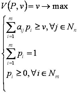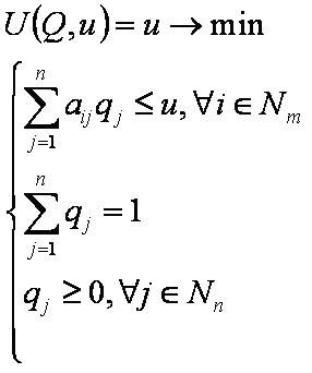 Невозможно разобрать выражение (Ошибка преобразования. Сервер («https://wikimedia.org/api/rest_») сообщил: «Cannot get mml. Server problem.»): {\displaystyle {\begin{cases}\sum \limits _{j=1}^{n}a_{ij}q_{j}\leq u,\forall i\in N_{m}\\\sum \limits _{j=1}^{n}q_{j}=1\\q_{j}\geq 0,\forall j\in N_{n}\end{cases}}}