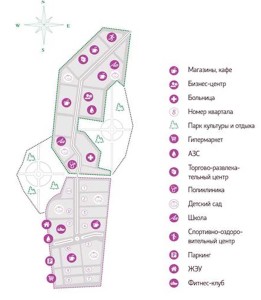 Для обеспечения удобства жильцов, планируется возвести множество объектов инфраструктуры: муниципальный детский сад, частные детские сад, две средние школы вместимостью 1140 детей каждая, поликлинику, торгово-развлекательный комплекс, бизнес-центр, два парковочных комплекса, ледовый дворец на 1000 посадочных мест, продуктовые магазины, аптеки, кафе.