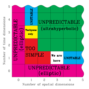 Макс Тегмарк[4] рассматривает гипотезы миров с размерностью времени T>1 с точки зрения антропного принципа и приходит к выводу о невозможности существования разумной жизни в такой модели мира. В общем случае неизвестно функционирование физических законов в мире с многомерным временем. Если Т отлично от 1, поведение физических систем не может быть выведено из знания соотвектствующих дифференциальных уравнений в частных производных. Разумная жизнь, способная использовать технологии, в подобной вселенной не могла бы возникнуть. Более того Тегмарк утверждает, что если T>1, протоны и электроны были бы неустойчивы и могли бы распадаться на более массивные часицы. (Это не проблема, если частицы имеют достаточно низкую температуру.). При T>1 субатомные частицы, распадающиеся в течении определённого периода, вели бы себя непредсказуемо, геодезическая линия для времени не обязательно была бы максимальной. Случай мира с размерностью пространства N=1 и времени T=3 обладает интересным свойством: скорость света является нижней границей скорости материальных тел, а вся материя состоит из тахионов. Тем не менее, сигнатуры (1,3) и (3,1) физически эквивалентны. Положительная длина вектора в пространстве Минковского для интервалов во времени, это условность, зависящая от договорённости о знаке метрического тензора. Так некоторые физики как правило, используют метрику с сигнатурой (+---), что приводит к положительной «длине» Минковского для времениподобных интервалов и энергии в то время как пространственное расстояние будет иметь отрицательную «длину» Минковского . Релятивисты, однако, как правило, придерживаются противоположной конвенции (-+++), что даёт для пространственного расстояния положительную «длину» Минковского.