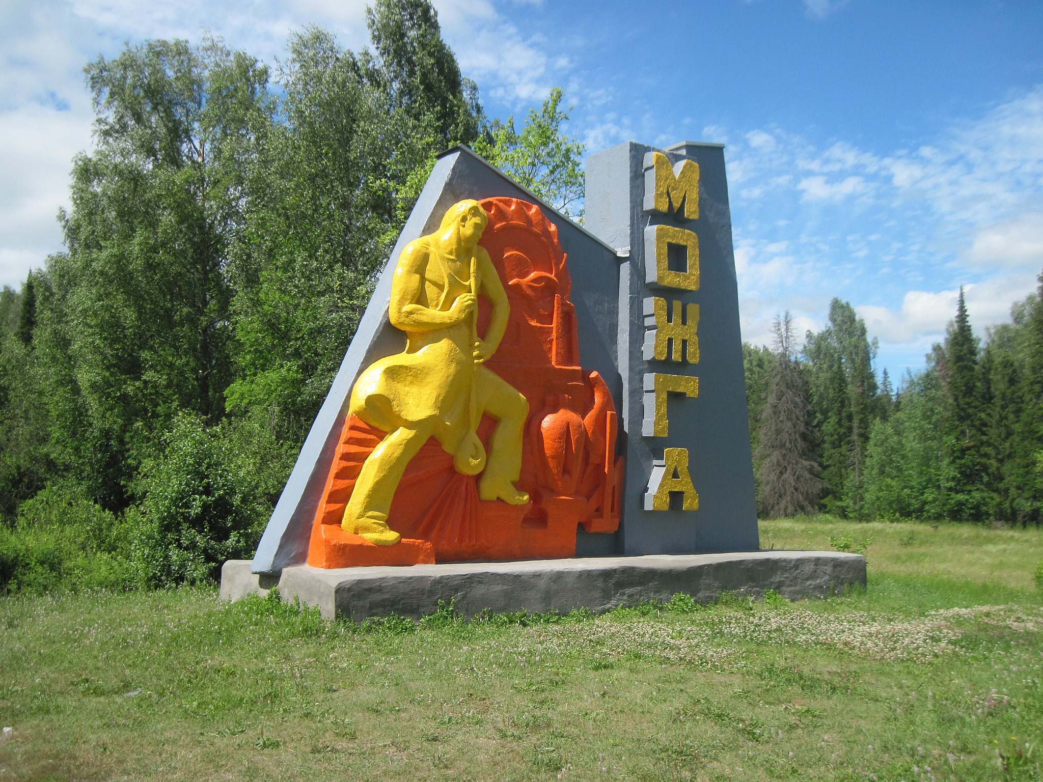 На въездной скульптуре в Можге изображён стеклодув. Развитие поселения связано со строительством Сюгинского стекольного завода на реке Сюга в 1835 году. Этот завод был возведён на средства елабужского купца Фёдора Григорьевича Чернова и стал известен благодаря производству технического стекла, кувшинов и фигурок животных. 3 апреля 1924 года посёлок Сюгинского завода был переименован в посёлок Красный, в котором из села Можга был перенесён административный центр Можгинского уезда. 26 октября 1926 года посёлок стал городом Красным, а 11 марта 1927 года получил название город Можга[15].