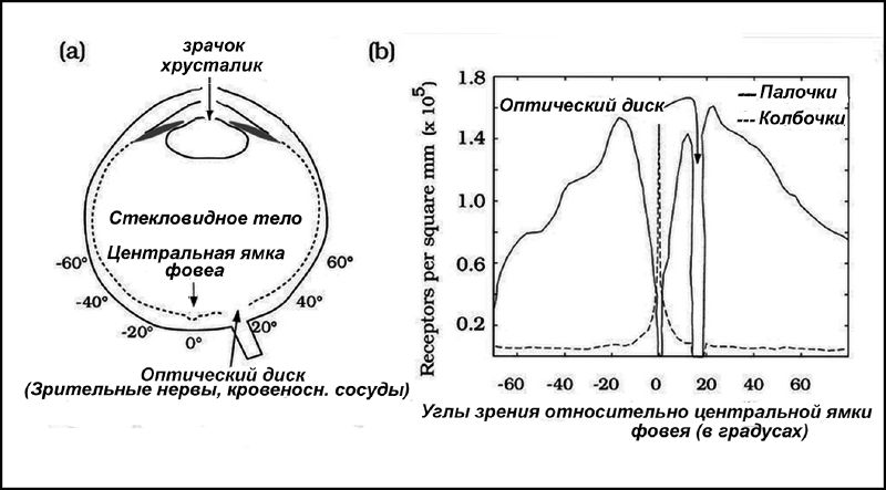 Здесь рассматривается отдельно мозаика каждого из различных типов экстерорецепторов колбочек и палочек сетчатки глаза. Существует два принципиально разных типа экстерорецепторов в нашем глазу — это колбочки и палочки. Есть около 5 миллионов колбочек и 100 миллионов палочек в каждом глазу. Позиции (мозаика) этих двух типов фоторецепторов во многом отличаются по всей сетчатке. Рисунок 3.1 показывает, как относительная плотность экстерорецепторов колбочек и палочек различается на сетчатке.