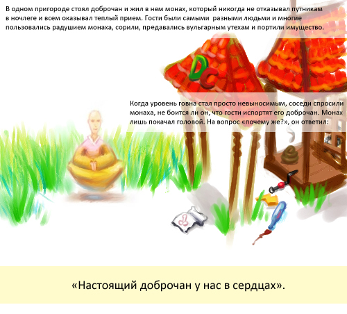 Картинка медитирующего Монаха, как правило, сопровождалась мемом-изречением Доброчана «Главное без фанатизма», призывая анонимов-завсегдатаев к спокойствию и умеренности в словах и делах. Также появился сатирический комикс, где Монаха, медитирующего в пшеничном поле, пытались вывести из себя мимопроходящие зелёные тролли, но в итоге, после того, как тот их напрочь игнорировал, уходили ни с чем.
