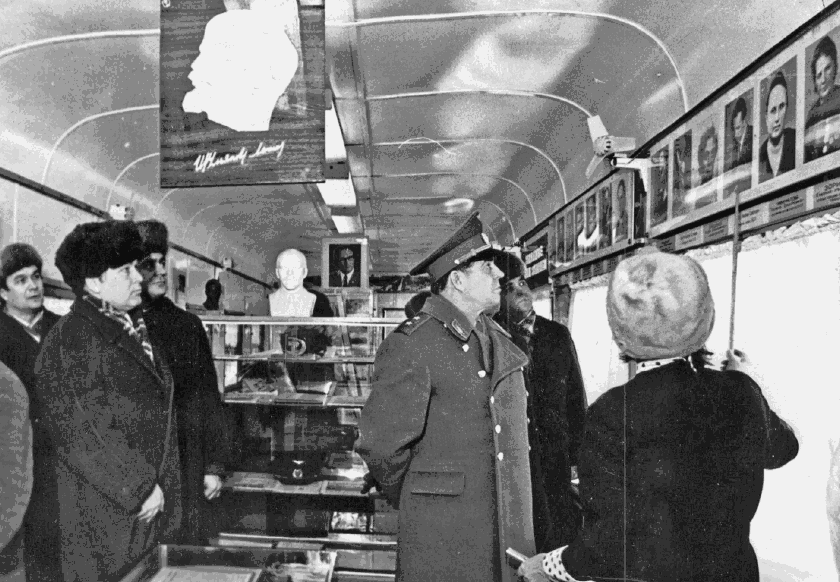 - в третьем вагоне находились материалы, посвящённые съездам КПСС и дружеским связям горожан с родственными предприятиями Российской Федерации, Грузии, Молдавии, а также ГДР, Кубы, Польши, Вьетнама и других зарубежных стран. Здесь же были представлены портреты Героев Социалистического Труда, делегатов съездов КПСС и ВЛКСМ, победителей в социалистическом соревновании.