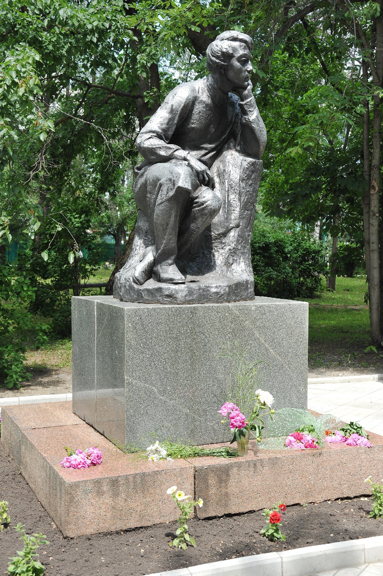 На небольшой площадке, где сходятся аллеи, установлен памятник юному Виссариону Белинскому, сидящему в задумчивости над книгой (1971, скульптор Георгий Малов). На лужайке посетителей встречает раскинувший крылья Журавлик (1992, художник Виктор Пензин) — символ Чембара, изображённый в его гербе[7].