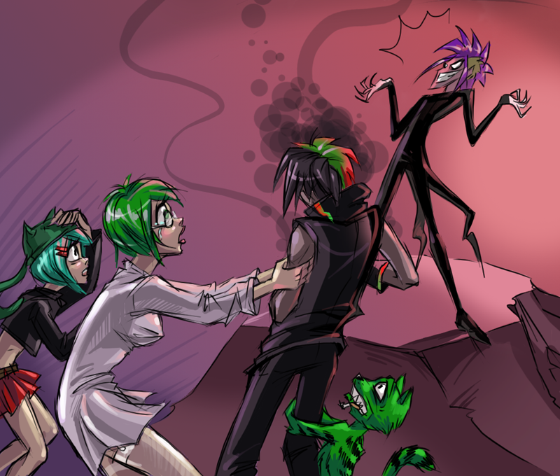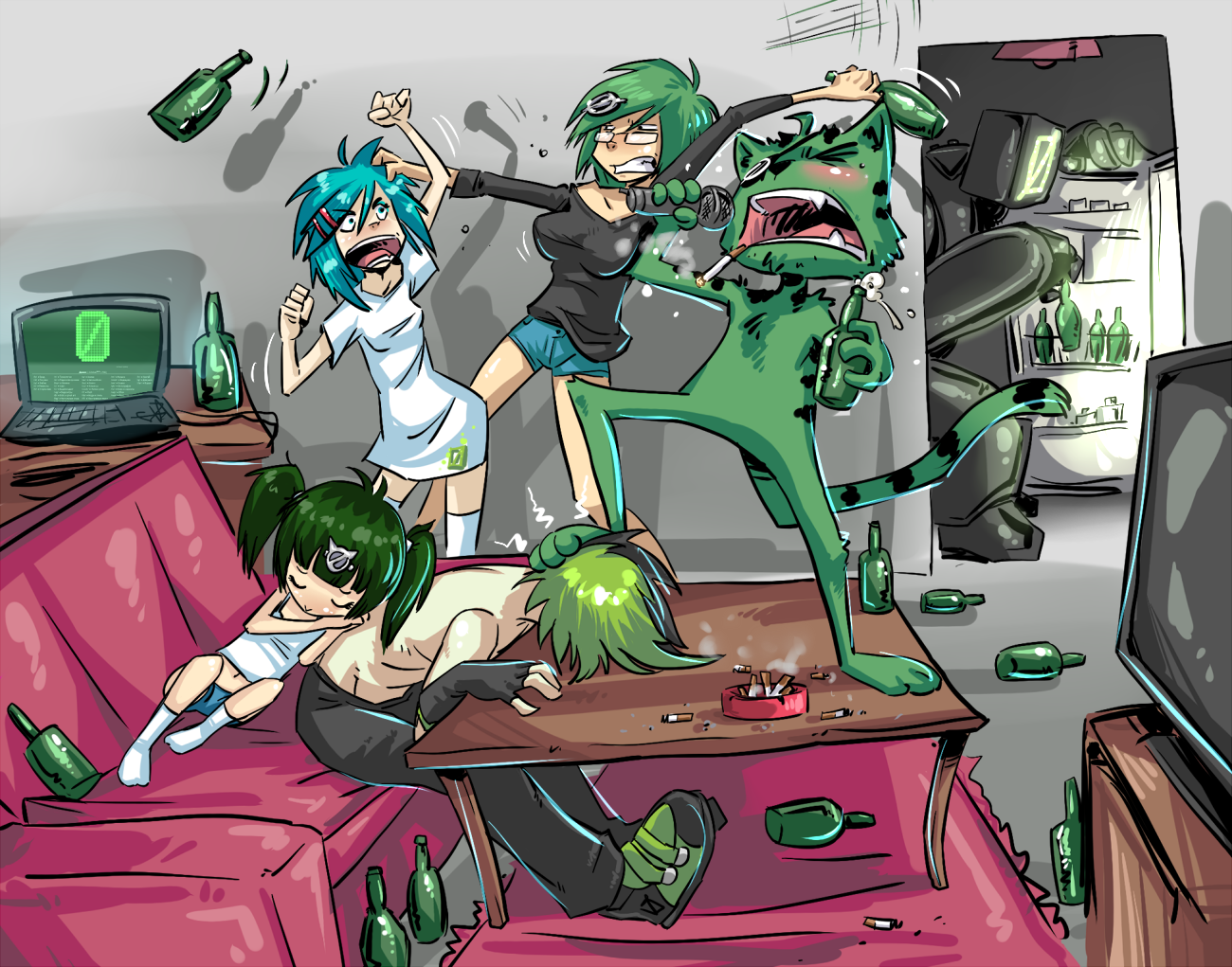 Мимо по коридору проскользнула милая тян в странной шапке: «Очередной дриш явился, рака мозга тебе» — прошипела сквозь зубы и исчезла за углом гипсокартонной стены. Анон решил из неуверенности, что это про него, но на этот раз он не ошибался. Девушка в халате показывала всю их небольшую квартирку, на кухне сидел какой-то кубический монстр, в гостиной, а точнее в комнате с телевизором, лежал кислотно-зеленый кот с повязкой на правом глазу, попивая пиво. На нем мирно спала лоли, тоже зеленоволосая.[2]