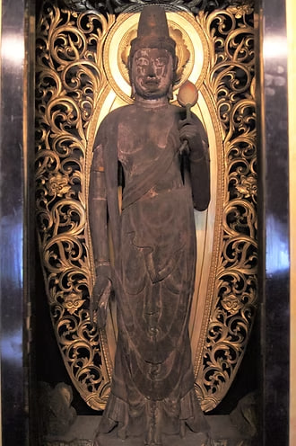 Скульптура вырезана из цельного куска дерева, в виде стоящей богини милосердия Каннон с правой рукой, вытянутой вдоль тела, в левой руке, поднятой на уровень груди, держит бутон лотоса. Цветная отделка и рисунок на юбке упрощены до сетчатого узора. Есть украшение в виде ромбовидных цветов и цветков сливы. Считается, что статуя изготовлена в конце раннего периода Хэйан. Общая высота статуи 205 см. В 1971 году признана объектом материального культурного наследия Осаки.