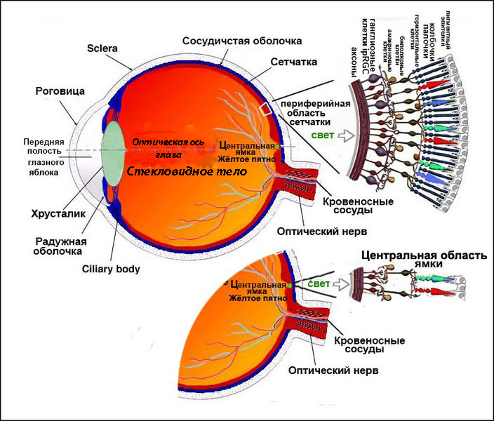 Рис.1. Глаз с центральной ямкой сетчатки и её периферийной областью