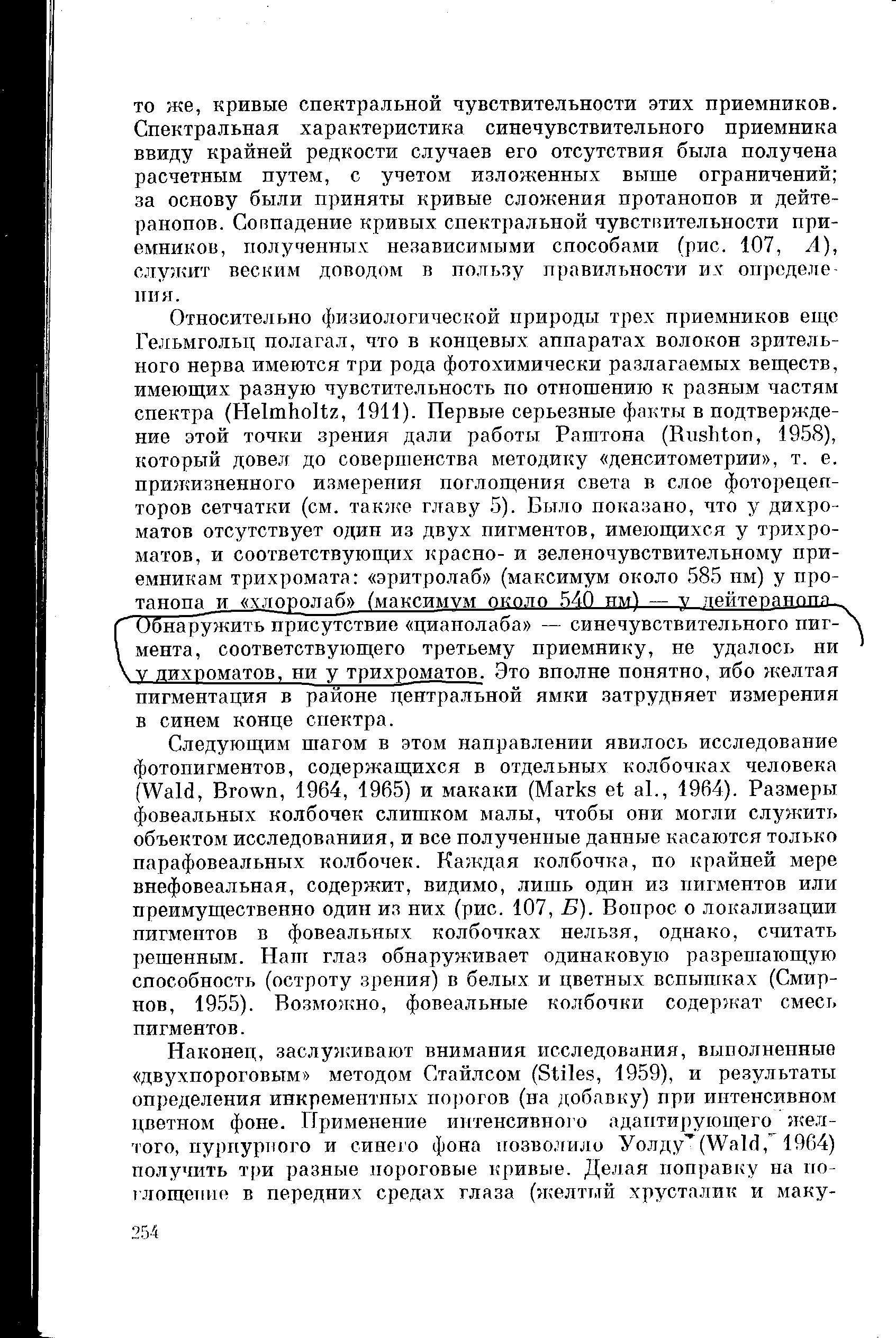 Привожу вам скан источника (Физиология сенсорных систем, издание Академии Наук), в который вы даже не удосужились заглянуть. Я обвёл удалённую вами часть, которая видимо не согласуется с вашими предположениями, или, что более вероятно, вы об этом просто ничего не знаете. Кроме того вы переделали на свой лад мою статью Цианолаб, вставив туда безграмотное утверждение: "...Пигмент, чувствительный к фиолетово-синей области спектра, названный цианолаб, у человека кодируется геном OPN1SW...". Довожу до вашего сведения, что ген, которым кодируется чувствительность к тому или иному участку спетра всего навсего - ГЕН входящий в состав того или иного фотопигмента. Но в приведённой вами ссылке нет ни слова про то, что кто либо открыл пигмент Цианолаб и тем более, что доказал, что этот ген содержится именно в нём, а например не в Родопсине. Выгугленное в интернете, к сожалению, не всегда правда... Анологично и со всеми вашими остальными правками...