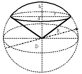 - Невозможно разобрать выражение (Ошибка преобразования. Сервер («https://wikimedia.org/api/rest_») сообщил: «Cannot get mml. Server problem.»): {\displaystyle \Leftrightarrow V_{\text{сект}}=V_{\text{сегм}}+sign(R-h)\cdot V_{\text{кон}},\ V_{\text{сегм}}={\frac {1}{3}}\pi h^{2}(3R-h),\ V_{\text{кон}}={\frac {1}{3}}\pi r^{2}|R-h|}