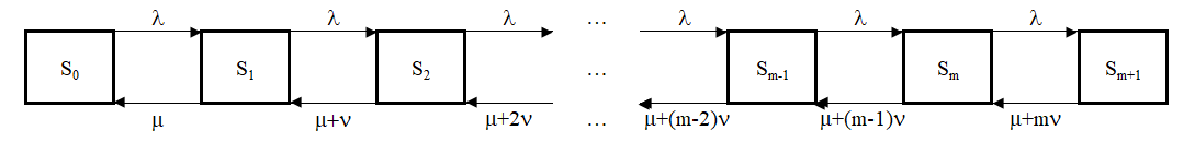 Sm+1 – в системе имеется (m+1)-заявок, 1-заявка обслуживается 1-каналом, m-заявок "нетерпеливо" ожидают в очереди;