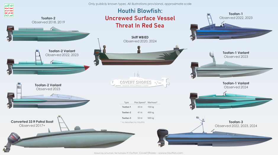 Беспилотные катера со взрывчаткой применялись хуситами в 2023 - 2025 годах при ударах по судам, которые, по мнению движения "Ансар Алла", были связаны с Израилем.