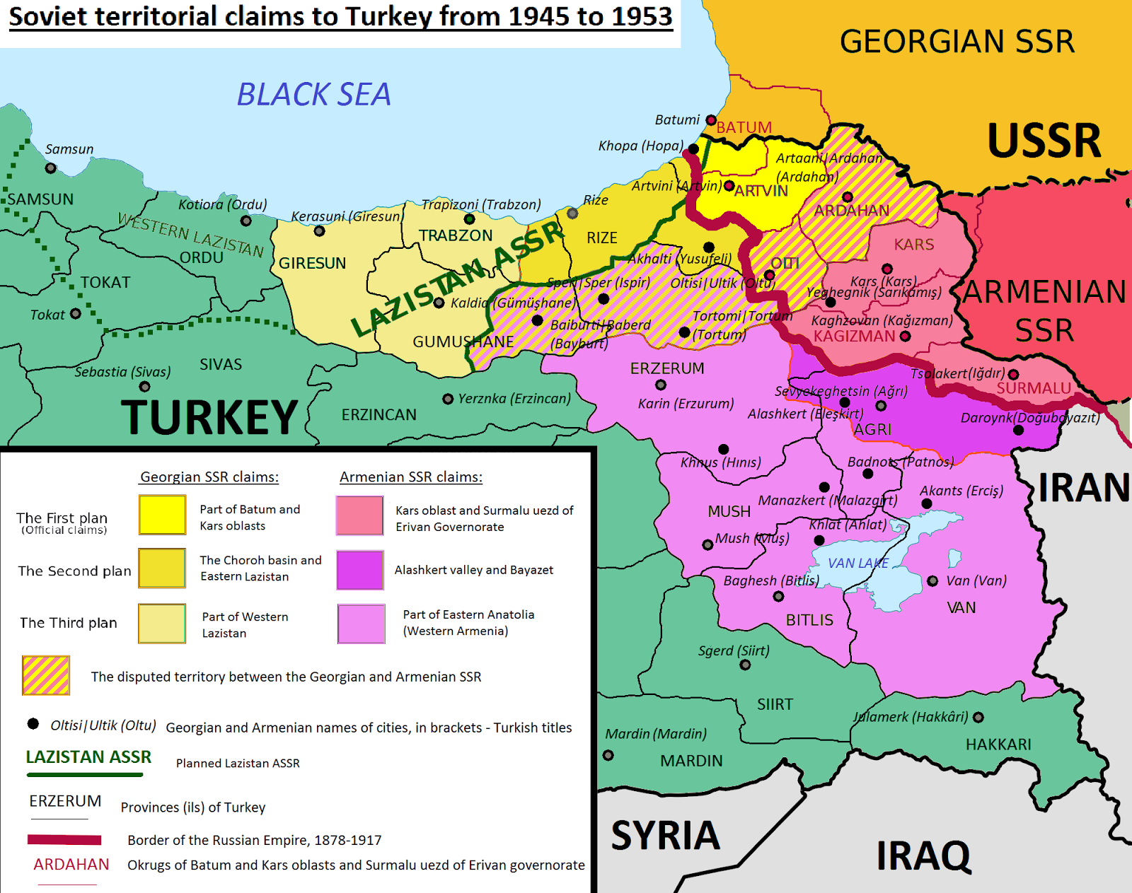 20 декабря 1945 года советские газеты напечатали статью двух авторитетных грузинских академиков-историков под названием «О наших законных претензиях к Турции», основанной на их собственных докладных записках, представленных ранее Молотову и Л.П. Берии, содержала призыв к «мировой общественности» вернуть грузинскому народу «земли предков», отнятые турками.