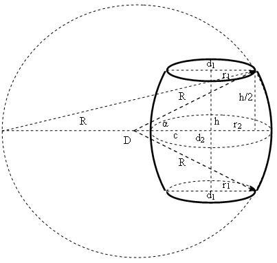 - Заметим, что когда расстояние от центра образующей дуги окружности до вертикальной оси бочки стремится к нулю, тогда формула площади поверхности круговой бочки превращается в формулу площади поверхности шаровой бочки.