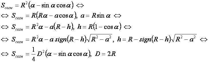 - Sсегм — площадь сегмента круга.