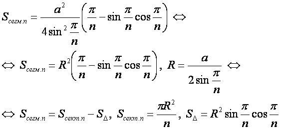 - Sсегм.n — площадь сегмента описанной окружности правильного n-угольника.