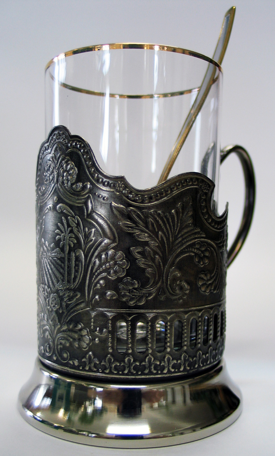 - Подстаканники мельхиоровые и нейзильберовые — посеребрённые с оксидированием, с выпуклым тиснёным рисунком;